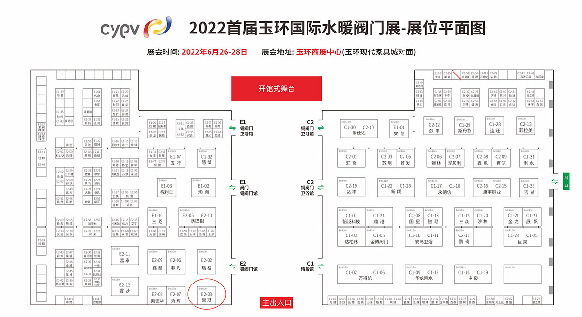 2022首屆玉環閥門展將于6月26日到6月28日在玉環國際會展中心舉行,皇冠閥門的展會號:E2-03, 詳情見展位圖,由于疫情原因,展會經多次延期,歡迎新來客戶光臨,同時參展期間,關注當地防疫政策,做好防疫措施。