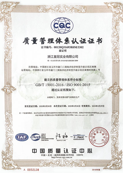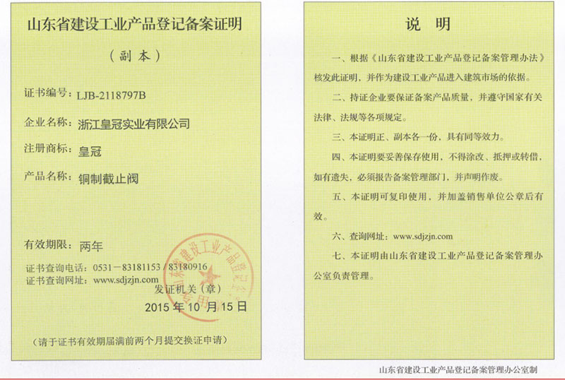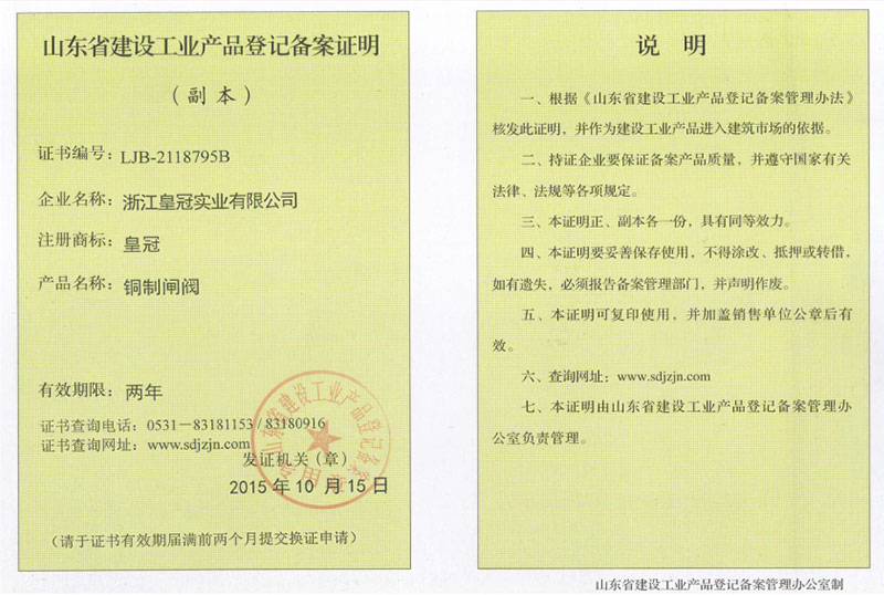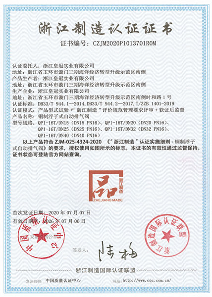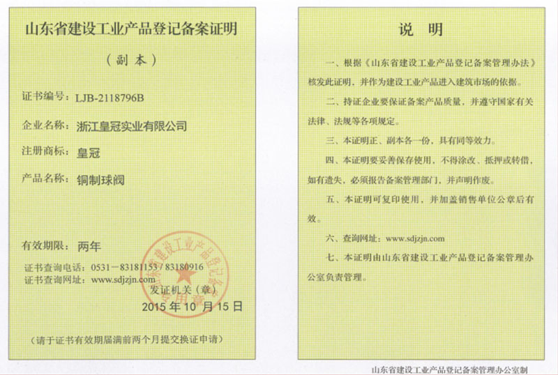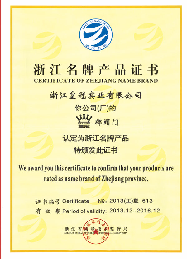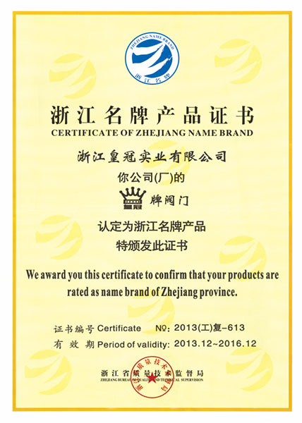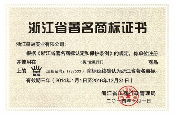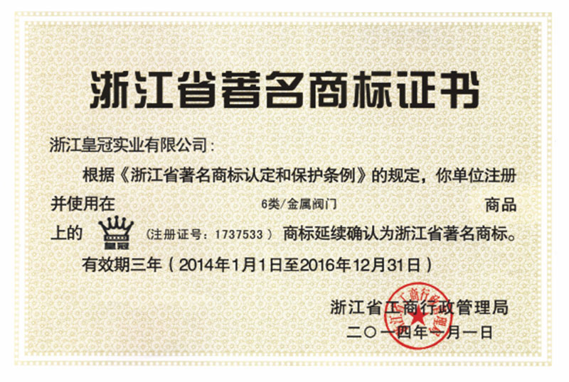 "皇冠"是浙江皇冠實業(yè)有限公司的注冊商標,"皇冠"銅閥門是《閥門用銅合金鍛件技術(shù)條件》國家標準起草單位,是《銅制浮子式自動排氣閥》行業(yè)標準起草單位,是《銅制浮子式自動排氣閥》品字標浙江制造標準起草單位, 是浙江省水暖衛(wèi)浴標準化專業(yè)技術(shù)委員會成員單位,是"守合同重信用"AAA級單位,是銀行信貸信用AAA級單位,擁有銅制浮子式自動排氣閥品字標浙江制造產(chǎn)品認證,已通過ISO 9001質(zhì)量管理體系認證、ISO 14001環(huán)境管理體系認證、OHSAS 18001職業(yè)健康安全管理體系認證、ISO 10012測量管理體系認證,產(chǎn)品由PICC中國人民保險承保, "皇冠"牌系列產(chǎn)品通過在大型建設(shè)工程中廣泛運用,取得了良好的社會效益,樹立了良好的企業(yè)形象,品牌在國內(nèi)擁有較高的知名度。