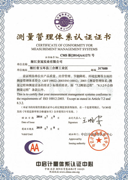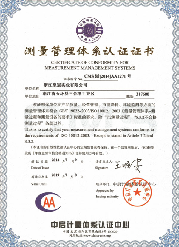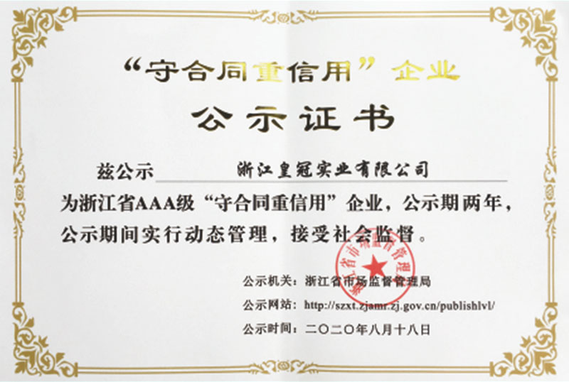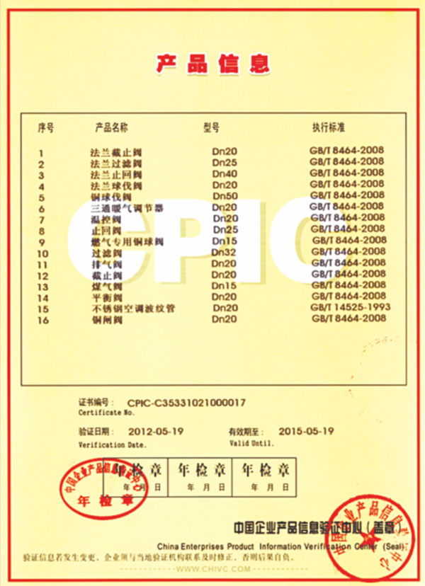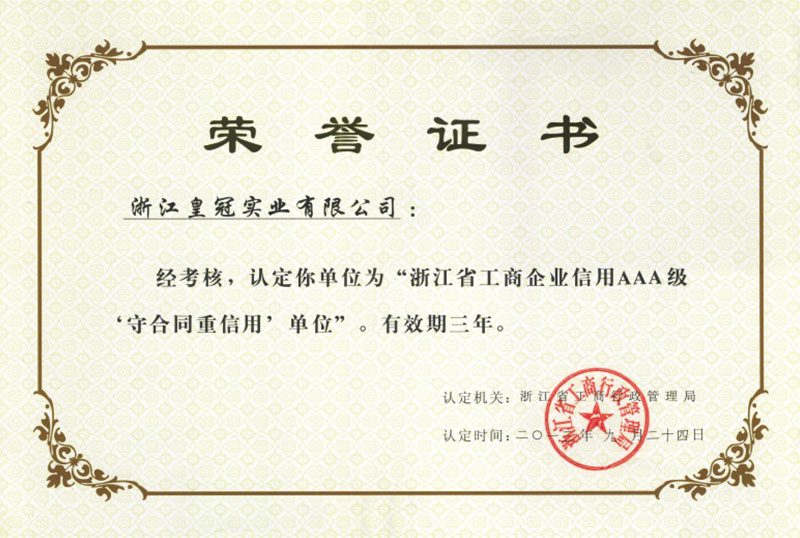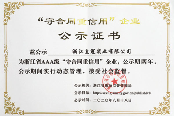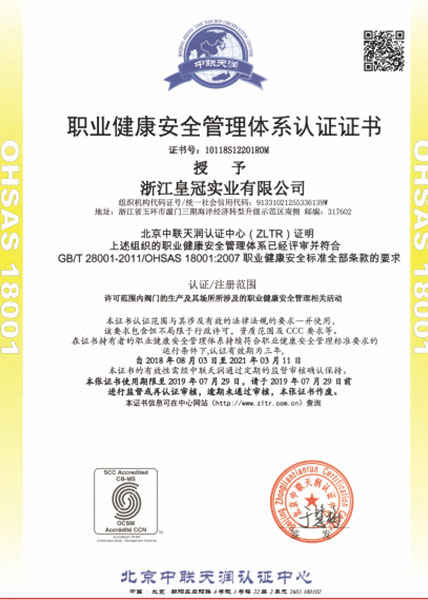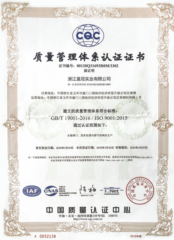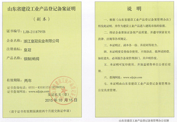 "皇冠"是浙江皇冠實業(yè)有限公司的注冊商標,"皇冠"銅閥門是《閥門用銅合金鍛件技術(shù)條件》國家標準起草單位,是《銅制浮子式自動排氣閥》行業(yè)標準起草單位,是《銅制浮子式自動排氣閥》品字標浙江制造標準起草單位, 是浙江省水暖衛(wèi)浴標準化專業(yè)技術(shù)委員會成員單位,是"守合同重信用"AAA級單位,是銀行信貸信用AAA級單位,擁有銅制浮子式自動排氣閥品字標浙江制造產(chǎn)品認證,已通過ISO 9001質(zhì)量管理體系認證、ISO 14001環(huán)境管理體系認證、OHSAS 18001職業(yè)健康安全管理體系認證、ISO 10012測量管理體系認證,產(chǎn)品由PICC中國人民保險承保, "皇冠"牌系列產(chǎn)品通過在大型建設(shè)工程中廣泛運用,取得了良好的社會效益,樹立了良好的企業(yè)形象,品牌在國內(nèi)擁有較高的知名度。